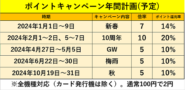 下記のスケジュール(画像参照)で、年間を通じて様々なキャンペーンを展開します。各キャンペーンでは、通常のポイント還元率を上回る特別な倍率でポイントを獲得できます。この機会をぜひお見逃しなく!